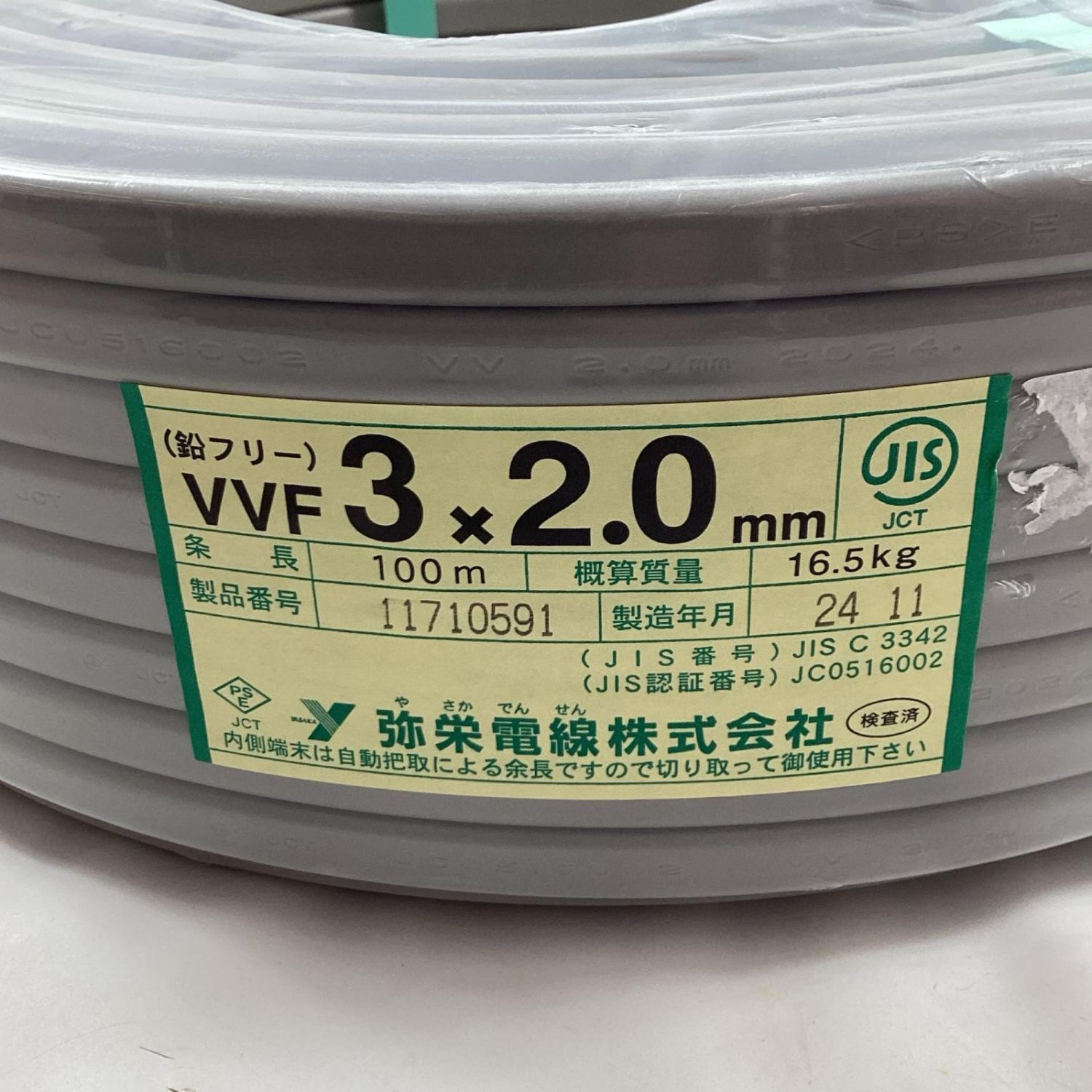 【商品名】中古 弥栄電線 VVFケーブル 3芯 2.0mm×100m 2024年11月製造 Sランク