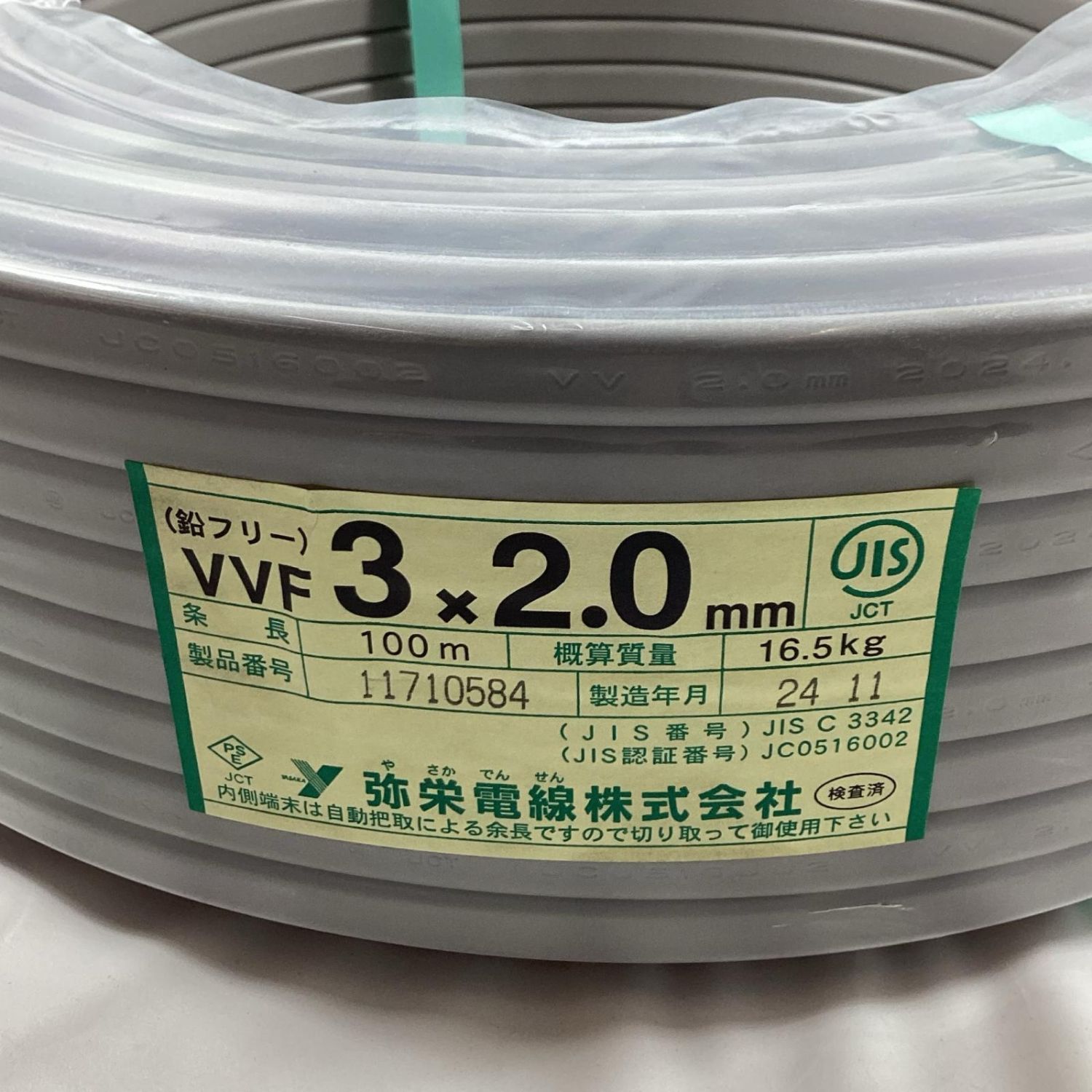 【商品名】中古 弥栄電線 VVFケーブル 3芯 2.0mm×100m 2024年11月製造 Sランク