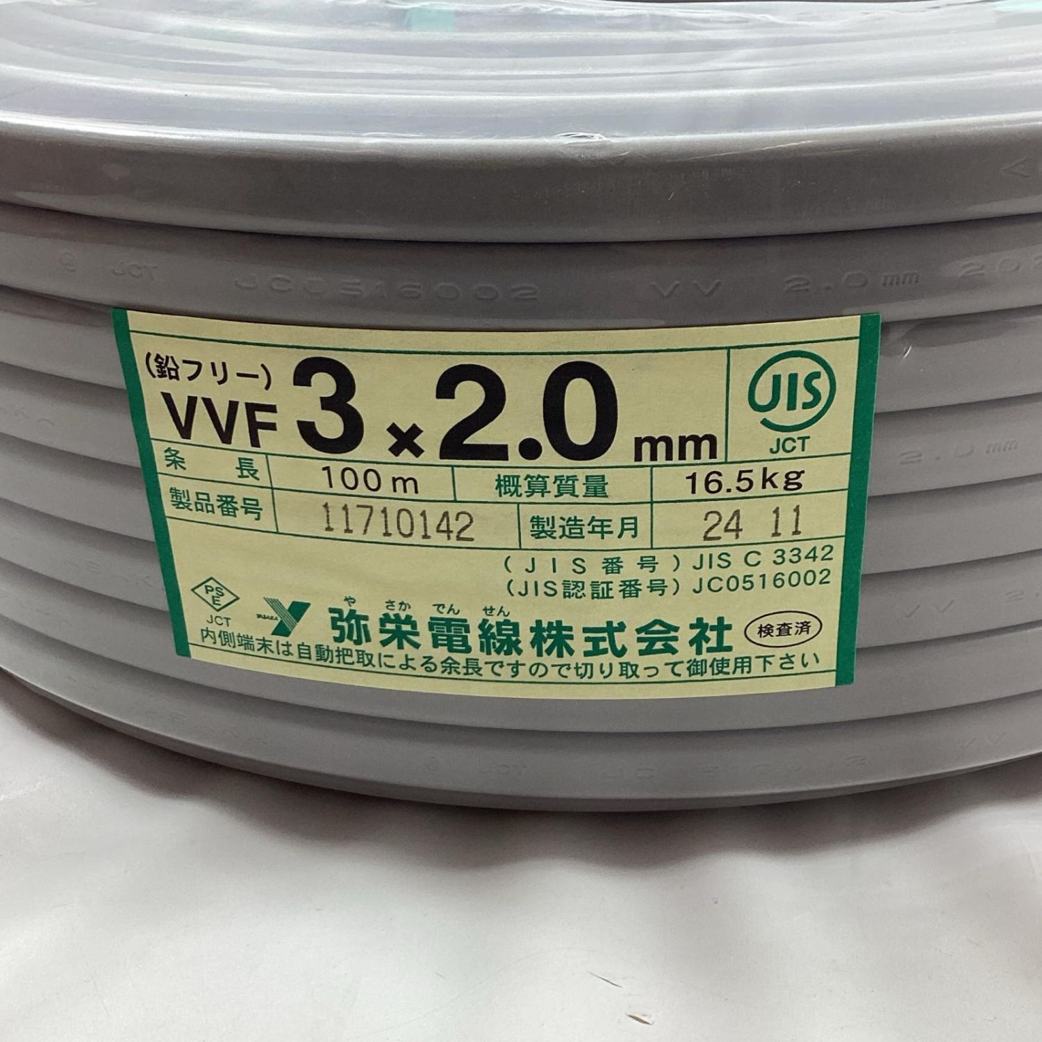 【商品名】中古 弥栄電線 VVFケーブル 3芯 2.0mm×100m 2024年11月製造 Sランク