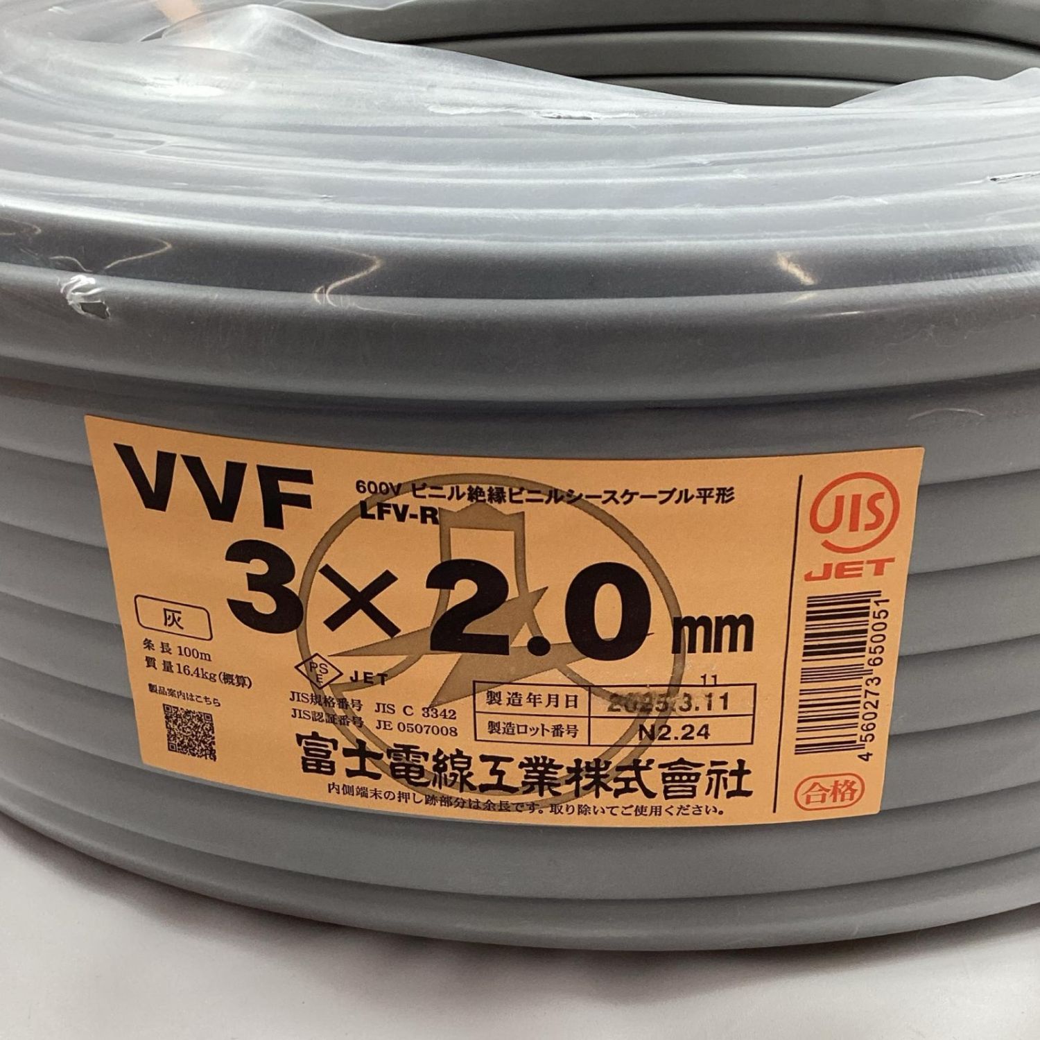 【商品名】中古 富士電線工業 VVFケーブル 3芯×2.0mm×100m 2025年3月製造 Sランク