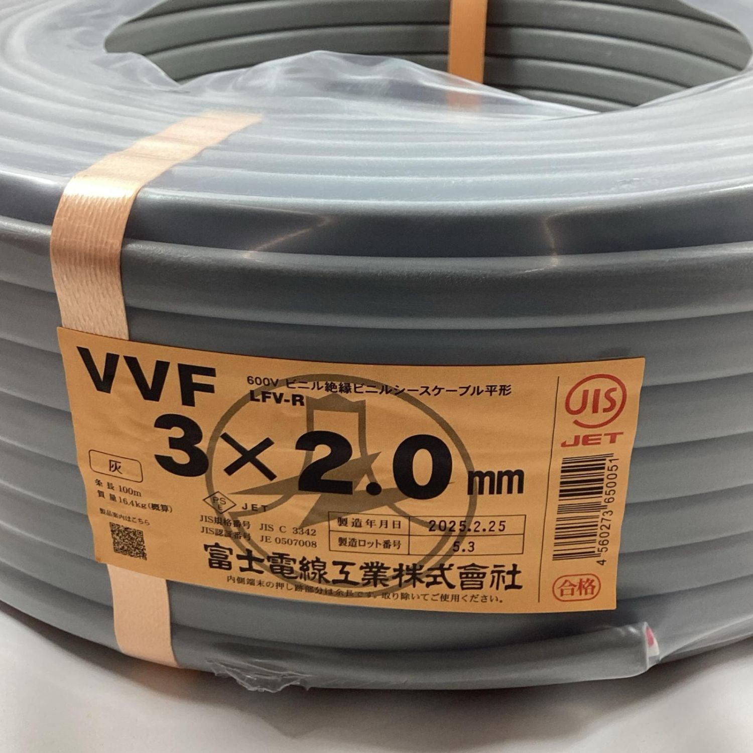【商品名】中古 富士電線工業 VVFケーブル 3芯 2.0mm×100m 2025年2月製造 Sランク