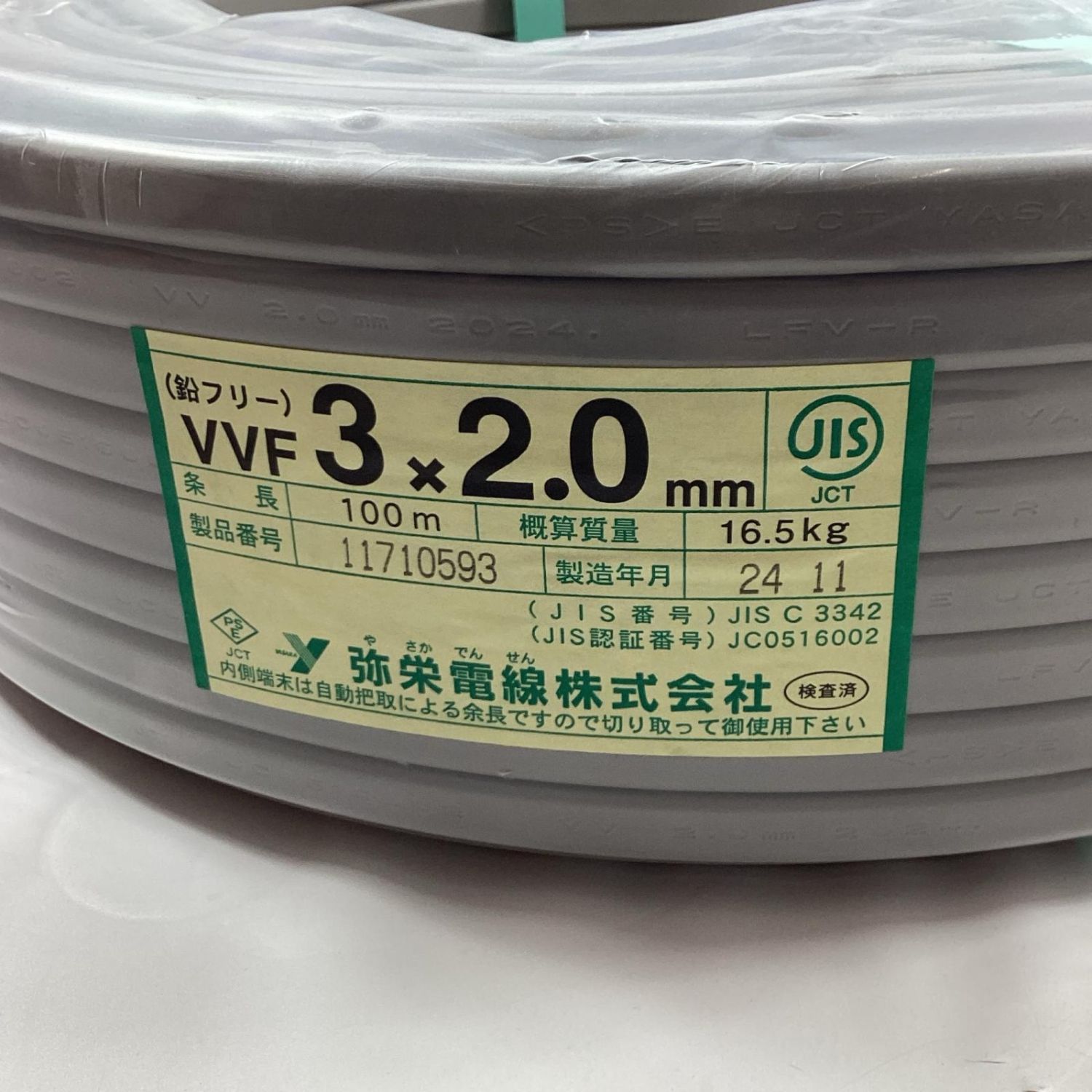 【商品名】中古 弥栄電線 VVFケーブル 3芯 2.0mm×100m 2024年11月製造 Sランク