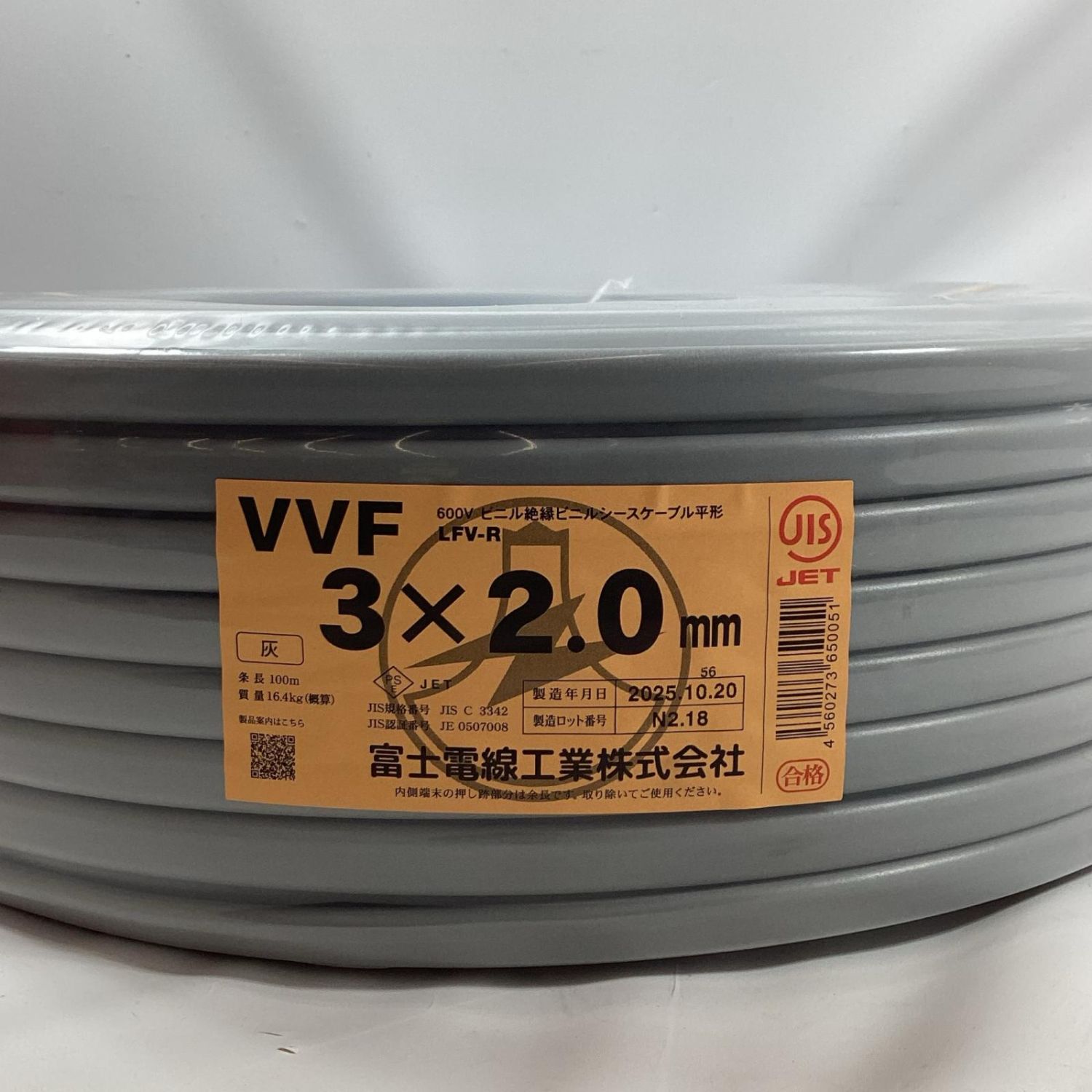 【商品名】中古 富士電線工業 VVFケーブル 3芯 2.0mm×100m 2025年10月製造 Sランク