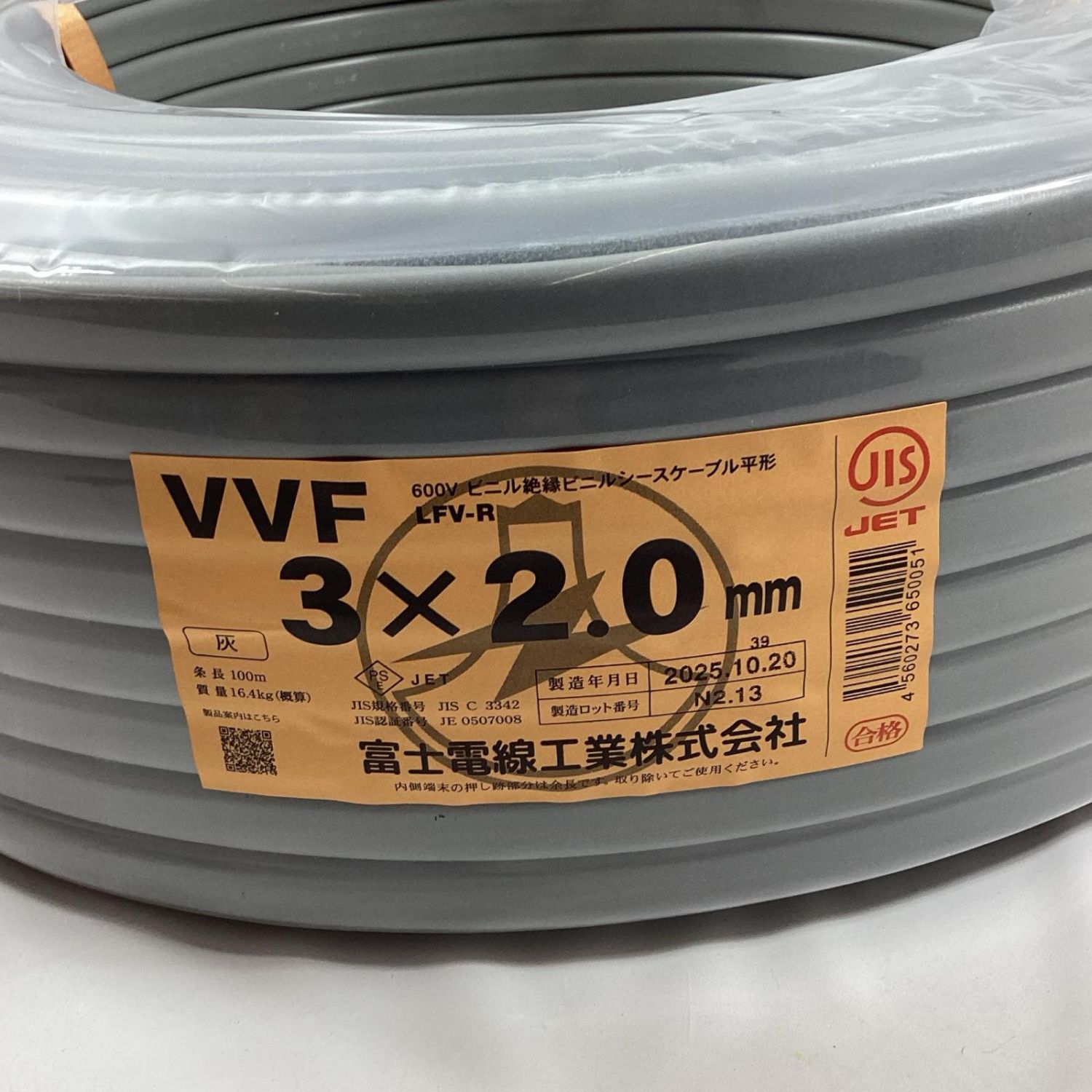 【商品名】中古 富士電線工業 VVFケーブル 3芯 2.0mm×100m 2025年10月製造 Sランク