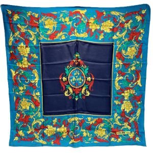 CELINE セリーヌ シルクスカーフ 花柄 ターコイズブルー シルク100% Bランク